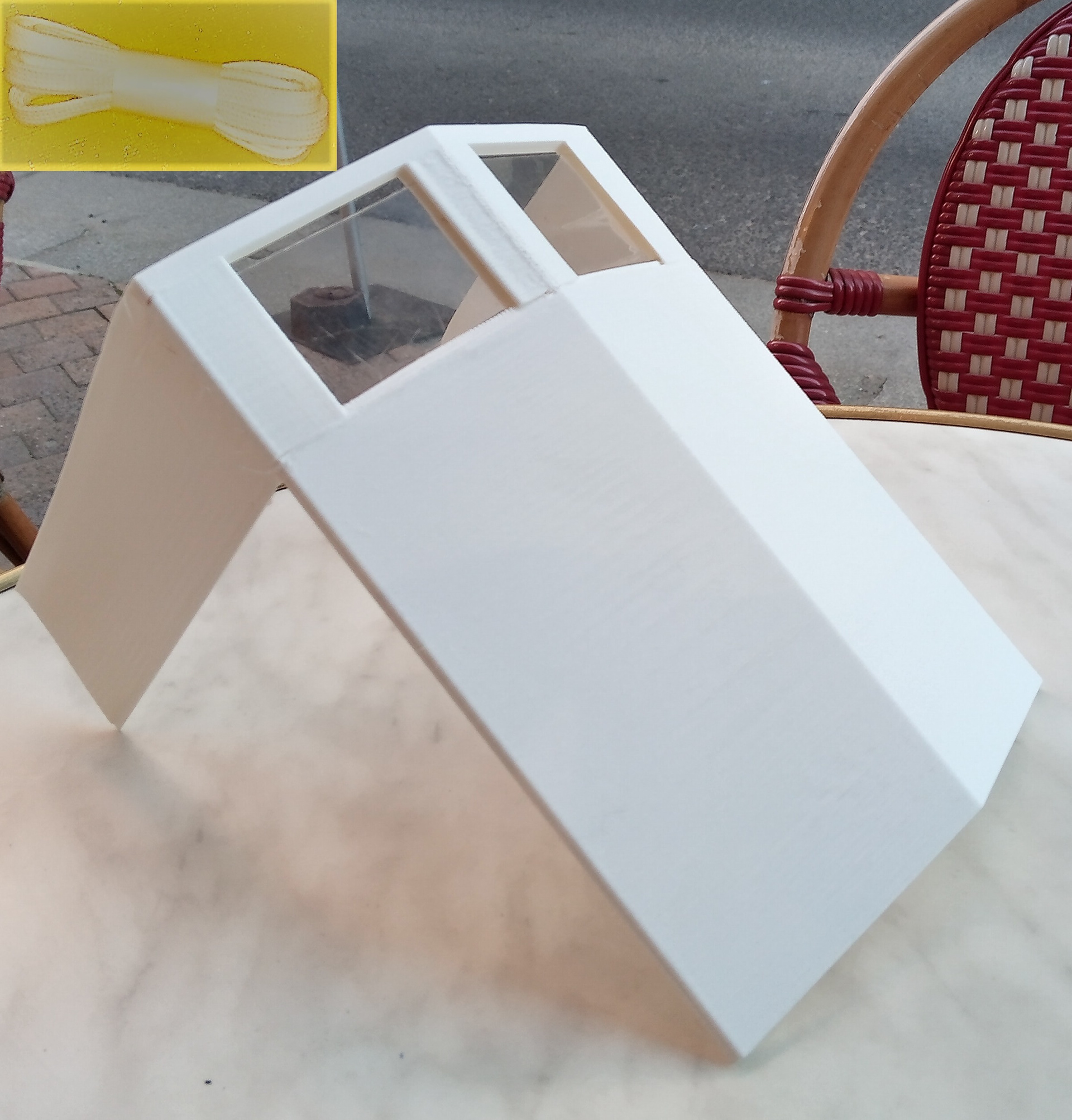 The glasses or plexi should have or can have a dimension of 3.6 cm per 6.4 cm. It's up to you to buy the plexi or glass, if you do not have it. It's also up to you to cut it if you have to. Last, you have to drill two holes for inserting the lace which will maintain the visor all around the head.