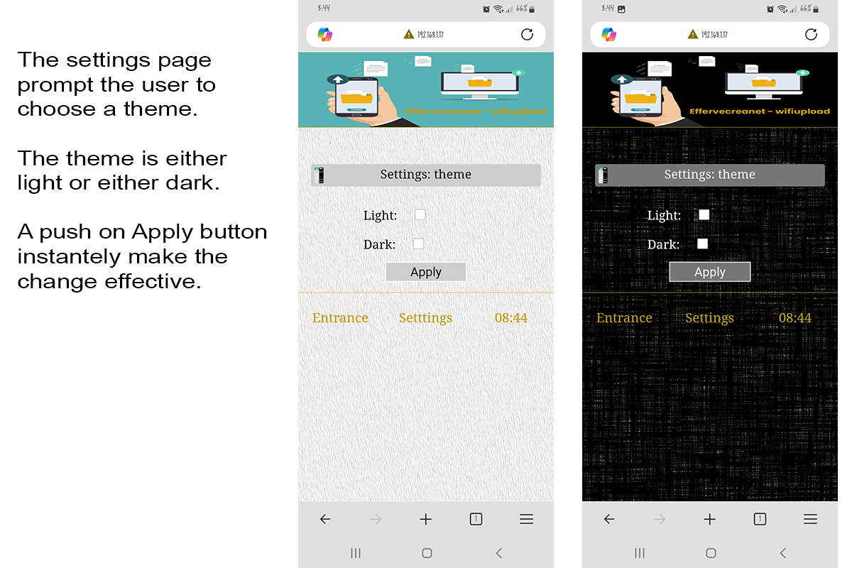 The transfer between computer and smartphone work only on domestic wifi network. And doesn't work on hotel, bibliotheque and other public wifi. Because on those network computer and mobile exist in two distinct network that doesn't communicate between both. The app comes with two theme: one dark and the other light.