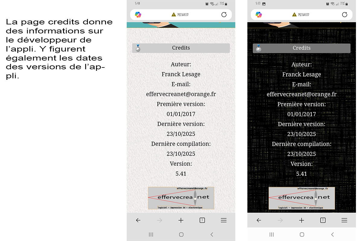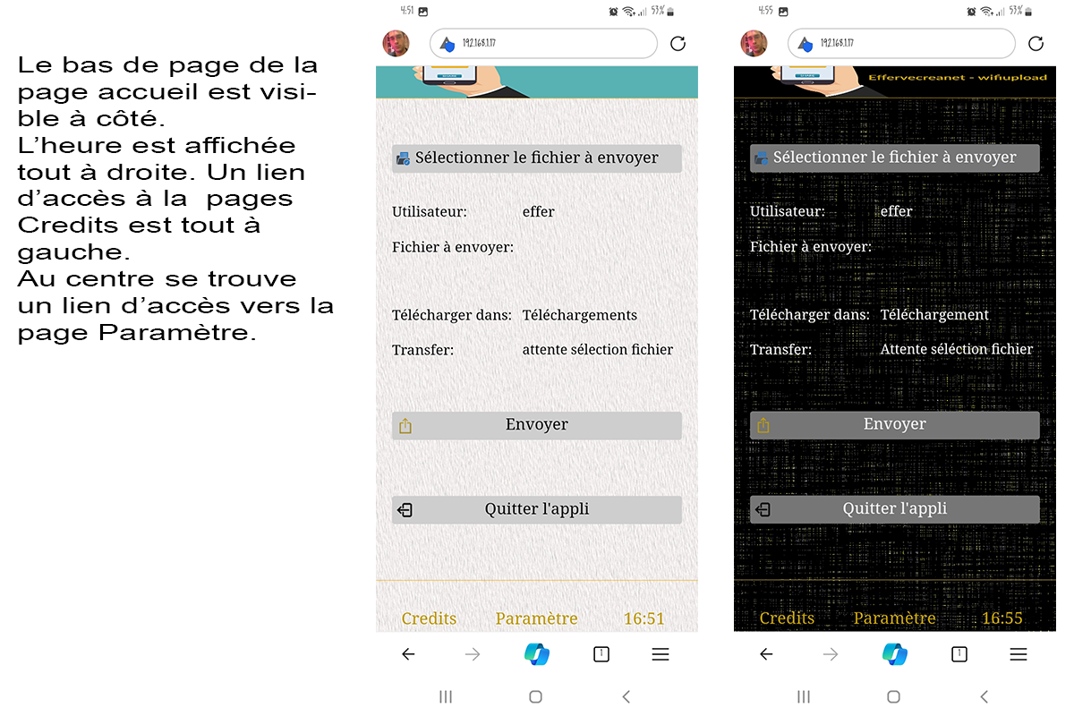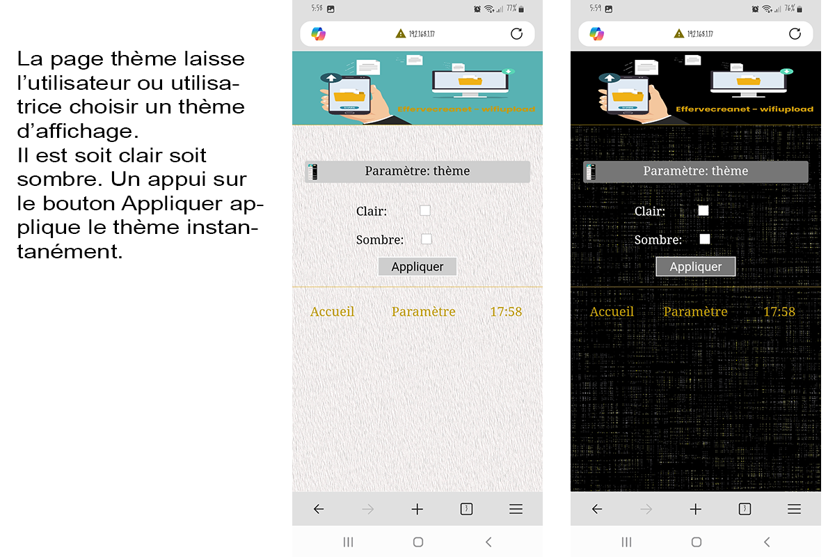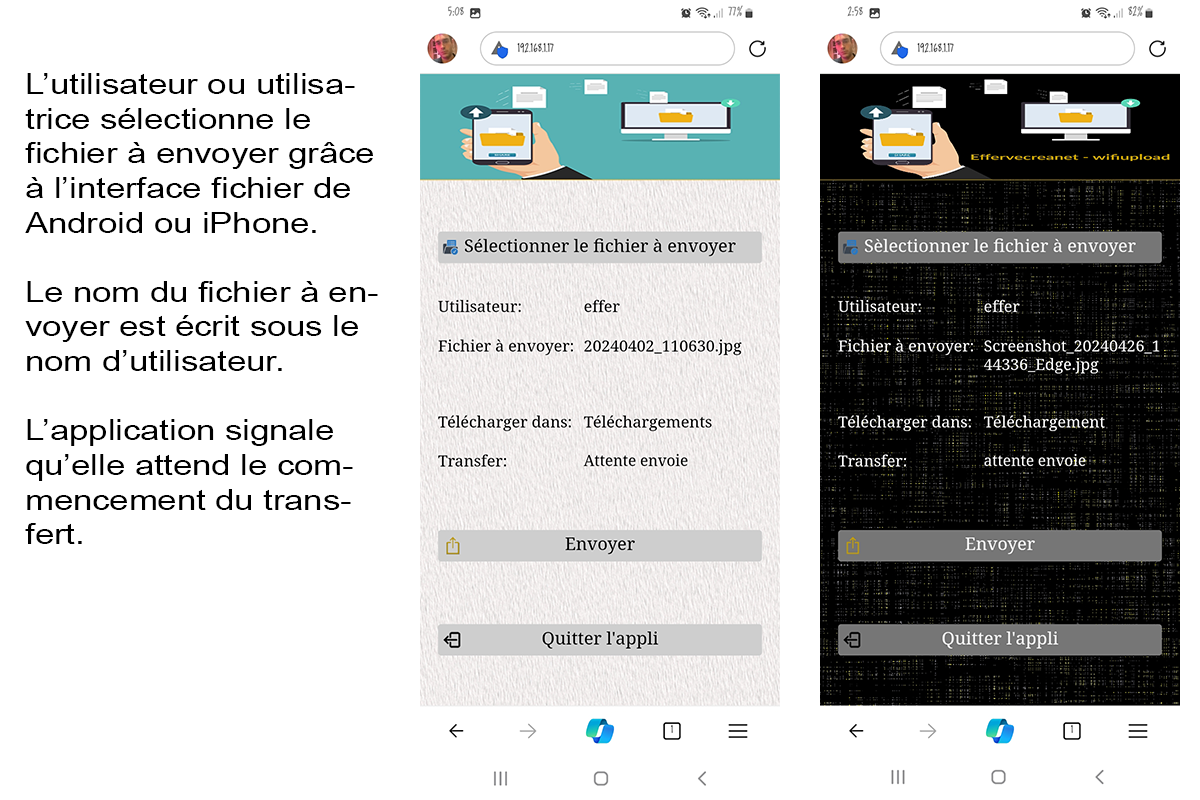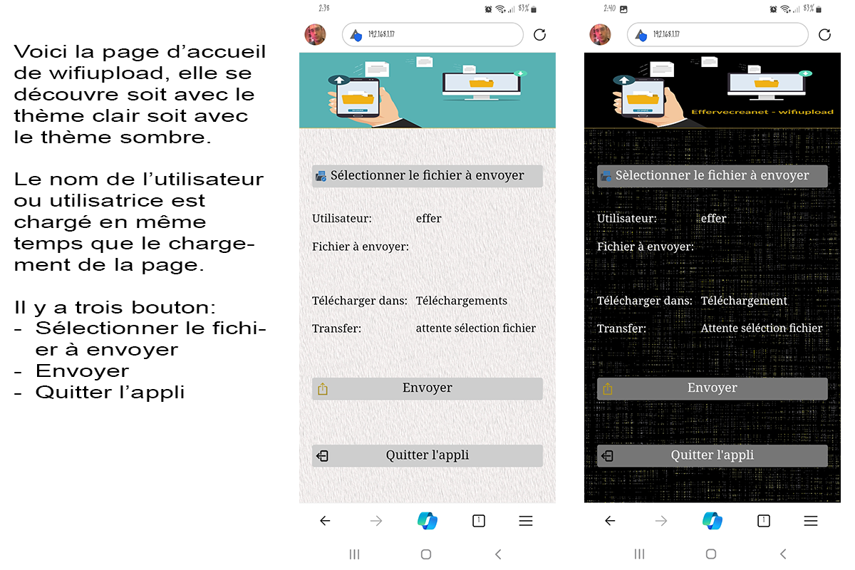 L'échange entre le mobile et l'ordi ne fonctionne que sur les réseaux wifi domestiques (ou de particuliers) et ne fonctionne pas sur les réseaux d'hôtels, de bibliothèques et autres wifi publiques. Car, dans ces derniers, ordinateur et mobile sont présents sur deux réseaux distincts et isolé chacun de l'autre. L'appli propose deux thèmes d'utilisation, un sombre ou un clair.