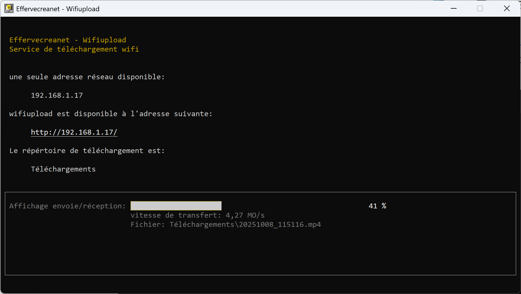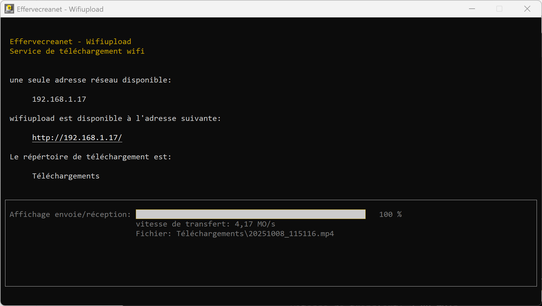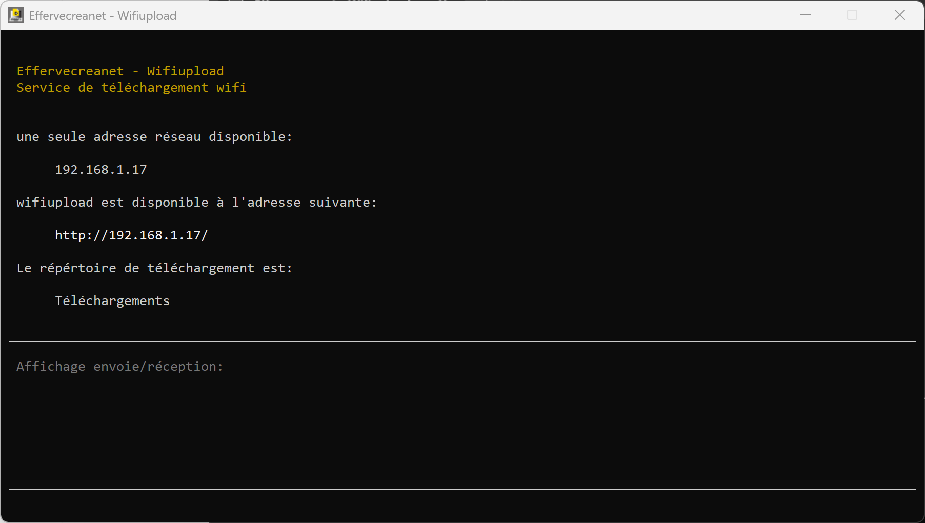 Une fois que vous avez installé wifiupload, vous cliquez sur le raccourci wifiupload et vous devriez avoir à peu de choses près la fenêtre suivante: