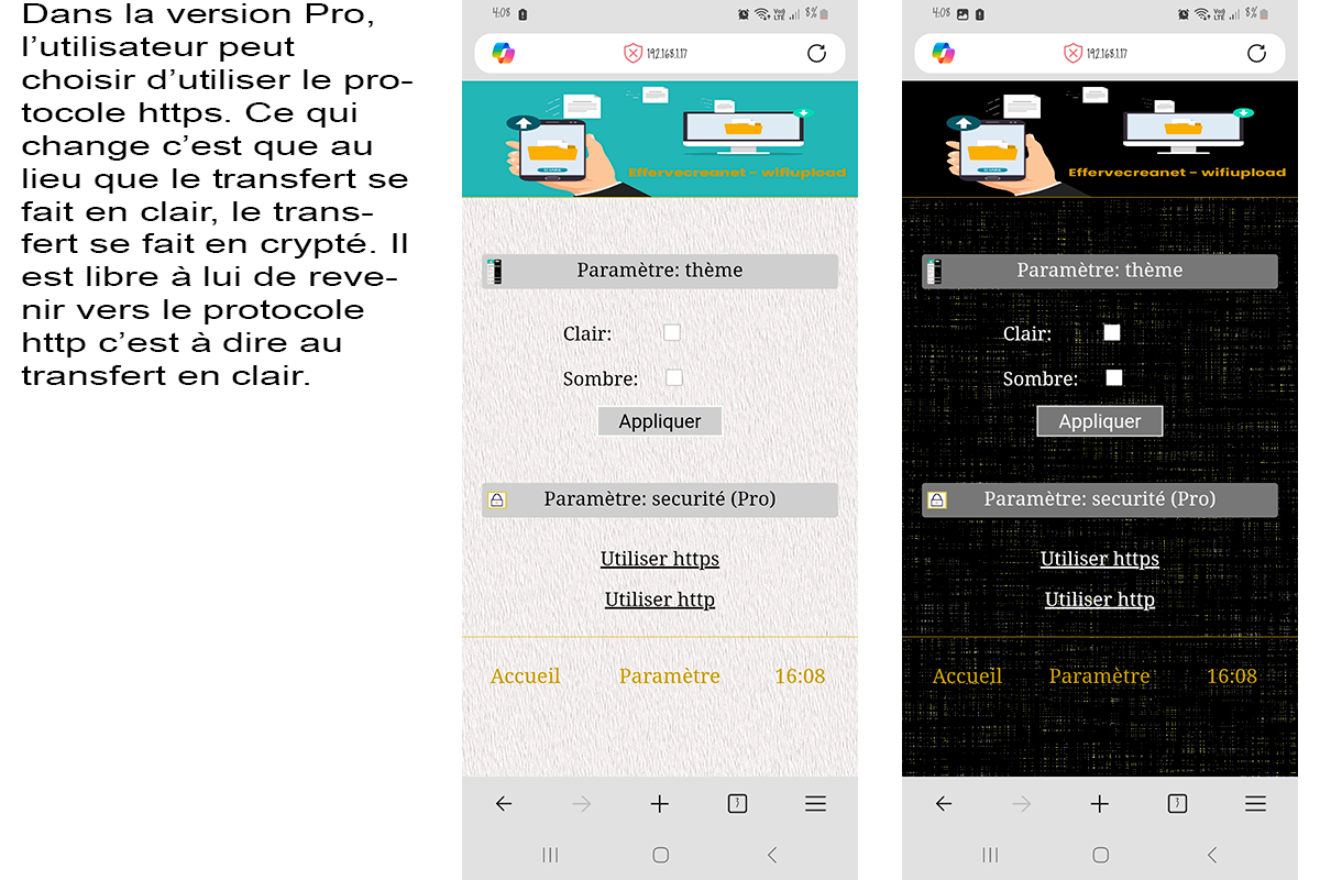 Il existe une version Pro de l'application. Dans cette version Pro, l'utilisateur peut choisir un transfert en crypté. Aussi, il peut revenir à un transfert en clair. L'image qui suit montre la page paramètre de l'application Pro avec les options de sécurité: http ou https.